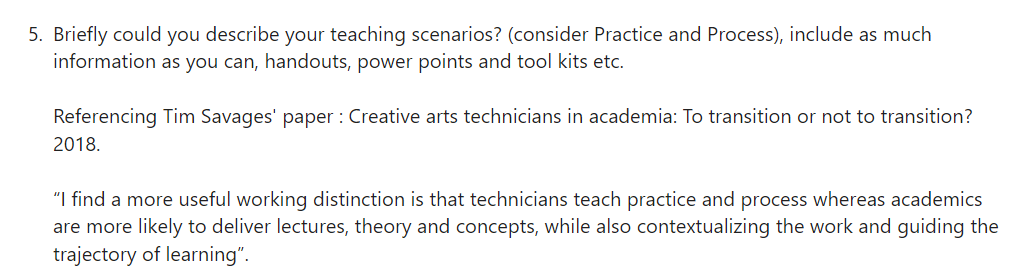 This question was presented in the presentation as well, allowing the participants the time to reflect on this quote from Tim Savage’s paper: ‘Creative Arts technicians in academia: to transition or not to transition? 2018’.