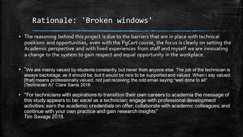 I have selected this quote, as it contributes to a part of my research, in the area of community and building upon a better working environment through peer engagement and community collaboration. Am I setting out to encourage technical staff to transition from the technical pathway? Or to help build a new technical pathway. Either or I encourage both areas, but my feelings and personal experience are that technicians are left in the dark and arenât properly introduced into academia.